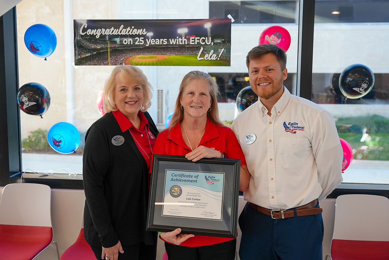 “The comments about Eglin FCU feeling like family couldn’t be more true,” Lela said. “Whether we’ve worked together for years or just a short time, each of you means the world to me and holds a special place in my heart. I’ve truly enjoyed serving Eglin FCU over the past 25 years, and I look forward to continuing this journey with my work family and making a difference for our members, because that’s what it’s all about.”